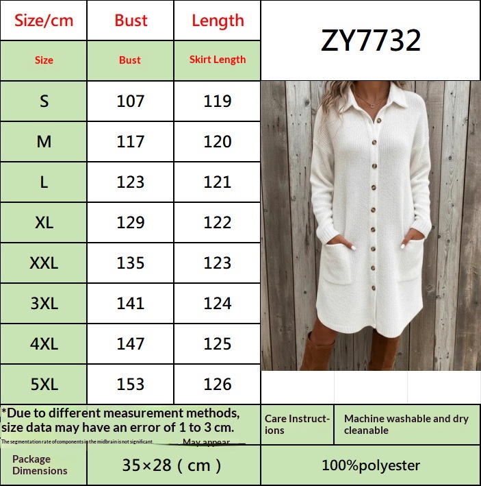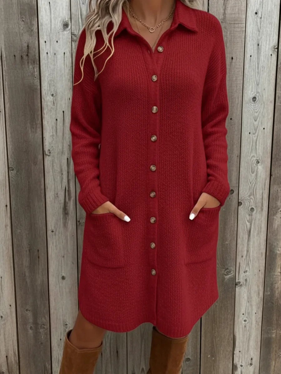 Knitted Button Down Solid Color Long Sleeve Pocket Cardigan Sweater Dress