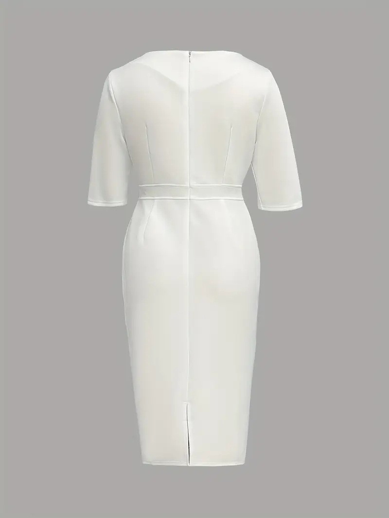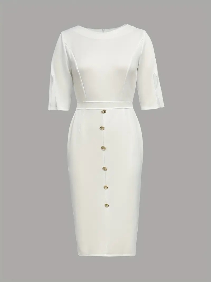 Summer Solid-Color Crew-Neck Defined-Waist Dress With Slit And Buttons